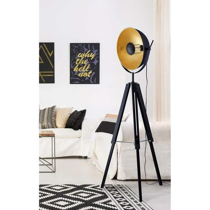 Pied de lampadaire trépied en bois noir. Style design et industriel. Dimensions : 78,5xH170cm